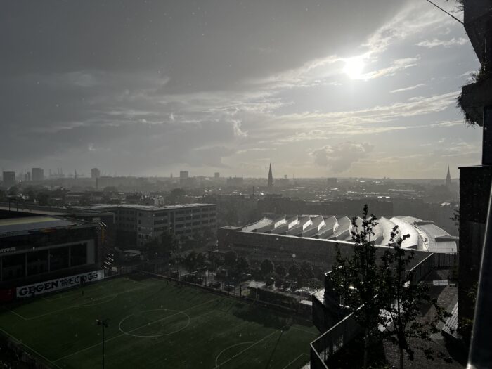 Zugegeben, es ist kein ganz unbeschwehrlicher Weg, hoch auf den Bunker an der Feldstraße, aber man wird doch an jeder Ecke mit schöner Aussicht belohnt, selbst bei Hamburger Wetter.